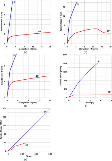 The angles 0° and 45° denote the direction of pure tension along the axis parallel to the fibres and at the direction 45° to the fibres (shear), respectively. Let us note that even for fibres directed at 0°, the physical non-linearity can be observed—Figure 1b–d. For plain woven roving, the non-linear behaviour is mainly the result of the thickness of individual layers. For aramid fibres (Figure 1a), the thickness is equal to 0.08 mm, whereas for glass and carbon fibres (Figure 1b,c) the thickness is equal to 0.22 mm. It seems to be significant for the micromechanical damage of specimens. For specimens subjected to tension with fibres directed at 45°, the analysis of the stress–strain diagrams demonstrates always non-linearity, but this behaviour is not identical—compare Figure 1a,c,d with Figure 1b,e. Let us note that the non-linear deformations of specimens oriented at 45° depend also on the form of manufacturing—compare Figure 1a–d with Figure 1e (the pultrusion).