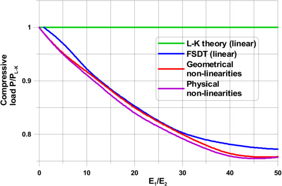 Figure 4 summarises the results of various numerical studies. All results are compared to the value of buckling loads obtained for the classical Love-Kirchhoff relations in order to observe the influence of kinematical assumptions on results. In general, numerical studies have been conducted for three different cases: