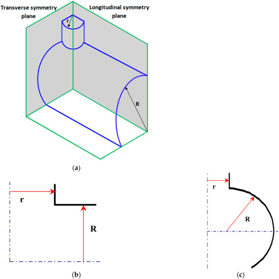 Cross-sections of the junction. (a) finite element model of the pressure vessel junction. (b) the longitudinal cross-section. (c) the transverse cross-section.