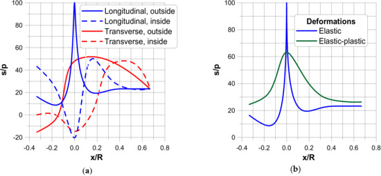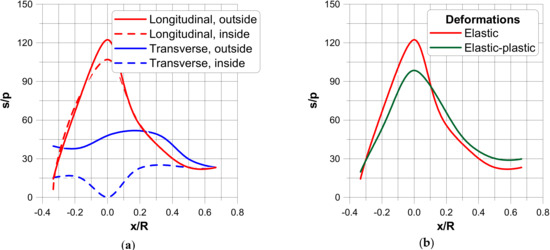 In the figures, the following notation is used: outside—z = t/2, inside—z = −t/2 (Figure 3), x denotes the length measured along cross-sections (Figure 5) where x = 0 corresponds to the position of the junction (the negative values are measured along the nozzle) and s is the value of the stress related to the value of the internal pressure p.The dimensionless stress distributions are demonstrated in Figure 6 and Figure 7 and they show evidently the necessity of the junction shape optimisation understood in the sense of adding an additional material called the reinforcement.