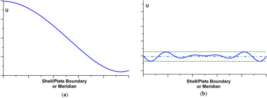 Shape optimisation of the shell reinforcement is connected with searching for the maximal critical loads that can be carried out by laminated structures, or it is introduced in order to equalise the stress (strain) failure criteria (in the sense of required yield condition or FPF criteria) around the boundaries or for the whole axisymmetric structure. However, it is not known in advance what type of failure criteria allows us to predict the lowest value of the failure load—see the discussion presented by Muc [23]. In addition, if we intend to equalise the values of the objective functional U (stress/strain criterion) along the junction C, then the optimisation problem differs qualitatively (the MinMax problem) from the typical formulations, leading to the limitation of the functional value, i.e., Max U(x) ≤ Uadmis, where Uadmis denotes the admissible, prescribed a priori value of the functional. For the MinMax problems using the finite element method of solution, it is almost impossible to satisfy such a condition in an exact manner, since it is very difficult to obtain the identical value of the functional U at each nodal point. Figure 8 demonstrates the possible variations of the objective functional U for the initial and the final (optimal) shapes (see Muc [23]). Therefore, it is assumed that the solution is optimal as the following condition is satisfied: