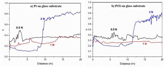 Overlapped graphs of friction coefficient as a function of the distance at an applied force of 0.5 N, 1 N, and 3 N, for (a) Pt on a glass substrate and (b) PtTi on a glass substrate.
