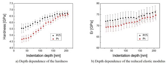 The mechanical properties of the samples were studied by nanoindentation using the QSpul method in order to study the response of the film-substrate system from the near-surface through the film-substrate interface up to the glass substrate. Each unloading segment of the QSpul force-displacement curve was evaluated using the method of Oliver and Pharr [29]. The QSpul method made it possible to determine the interval of indentation depths, where the measured data represent the film properties, and the interval of indentation depths, where the measured data are already affected by the substrate. According to FEM results in [31], for soft films on harder substrates, the measured film hardness value is not affected by the substrate hardness, substantially up to an indentation depth equal to half the film thickness. Contrary to the hardness, the elastic modulus exhibits a more sensitive response to the substrate elastic properties with the increasing indentation depth. In the case of the film with a lower elastic modulus compared to the substrates, the indentation depth should be around one-tenth of the film thickness in order to get the correct value of the elastic modulus. According to work described in [29], the hardness results obtained around indentation depths of 50 nm represent the film hardness, and, for the results obtained from 150 nm of indentation depth, the influence of the substrate material (glass) is dominant [32]. The film elastic properties might be estimated on the bases of the reduced elastic modulus values obtained at indentation depths lower than 50 nm. The results from indentation tests were in good accordance with the results of the film wear resistance (see the distance traveled before reaching the substrate in Table 3) obtained using the tribological measurements. The PtTi film showed significantly higher hardness (5.5 ± 0.1 GPa) than the Pt film without Ti content (4.7 ± 0.1 GPa). However, their elastic modulus differed only slightly (see Figure 5).