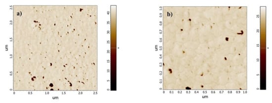 For the Pt thin film on a glass substrate, the average roughness was Ra = 3.8 nm. According to the phase maps, the film consisted of nanograins with a diameter of approx. 100 nm, indicated by the phase contrast maps in Figure 6.