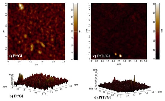 Having said that the deposited layer thickness was about 100 nm, the roughness values, presented in the Table 4, were negligible for non-critical applications (e.g., semiconductors, reference parts, etc.). The peaks shown in the AFM 3D profile for the PtTi film were due to surface impurities and could be mitigated using surface treatment processes.