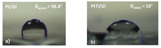 By using SEE System, we managed to determine the hydrophilicity or hydrophobicity of the surfaces of the deposited films. The measurements were carried out in air at room temperature for Pt and PtTi on glass substrates, using a sessile drop method and 2 µL deionized water droplets. For each sample, the contact angles were measured five times, and the average values were adopted (Figure 8).