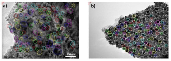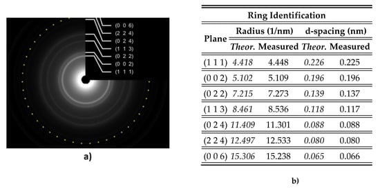 The grain’s mean size for the Pt/Si sample was estimated to be ~4.5 nm (Figure 9). The crystalline structure was revealed by means of electron diffraction [37,38,39]. The rings identified on the SAED pattern could be ascribed to Pt face-centered cubic structure with lattice parameter a = 0.392 nm. Figure 10b shows measured values against theoretical values.