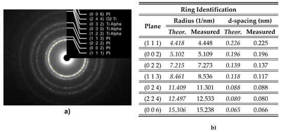 In the case of PtTi films, the crystalline structure was carried out by means of electron diffraction (Figure 10).