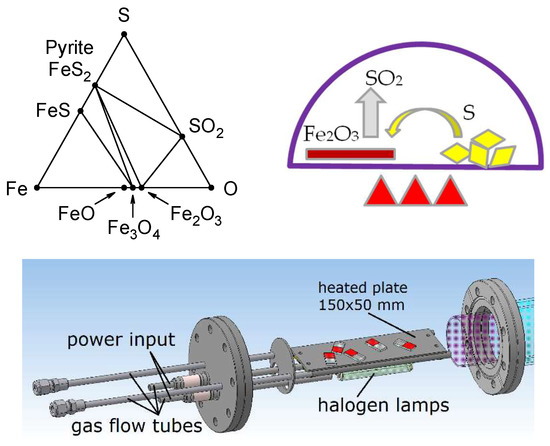 Fe-O-S phase diagram (top left), schematic of iron oxide sulfidation at a temperature of about 350 °C and atmospheric pressure (top right); and 3D model of the vacuum mini furnace for the iron oxide sulfidation of samples used in this article (bottom).
