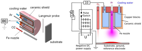 The hollow cathode plasma jet (HCPJ) is installed in the high vacuum chamber. The pure Fe (99.96%) nozzle is surrounded by copper blocks cooled by a water flow. While the argon is introduced into the system via the hollow cathode, the oxygen inflow tube is positioned a few centimeters away from the cathode (see Figure 2). The distance between the nozzle exit and the substrate is variable, 4–7 cm. The substrates were glass, silicon wafer and fluorine doped tin oxide (FTO) glass. The FTO film on the glass has the sheet resistance of 7 ohm/sq. This FTO film functions as a transparent electrode and provides the parallel conductivity to the contact in the assembled solar cell.