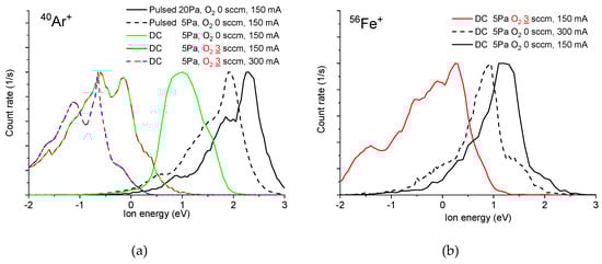The addition of 3 sccm of oxygen to the working gas inside the reaction chamber leads to a significant decrease in the measured ion energies in DC mode (see top row of Figure 3 with Ar+ and Fe+ ions). The energy of the lowest measured energetic peak of Ar+ is about −1 eV. This apparently negative ion energy can be explained by the shift of the plasma potential to negative values after oxygen addition. This shift was measured in [13]. Although the sampling orifice of the spectrometer is grounded, it is covered by a nonconducting layer of iron oxides which are negatively charged. The negative charge attracts positive ions toward the sampling orifice. Since the mass spectrometer references the ion energy to ground, the positive ions coming from the negative plasma potential appear to have negative energies.