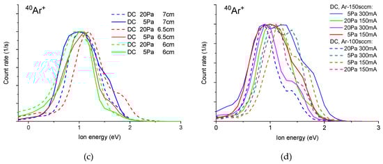 Energetic spectra for argon in DC and pulsed DC modes (a) and iron in DC mode (b). Energetic spectra for argon in DC mode for different pressures and distances from cathode (c) and argon flow rates (d). Default parameters: distance from cathode 7 cm, Ar flow 150 sccm, O2 flow 0 sccm, discharge current 150 mA and pulsed mode duty cycle 10% at frequency 1 kHz.