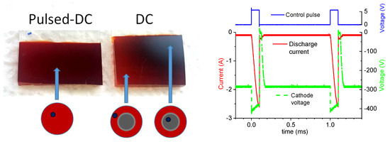 Photos of homogenous (pulsed-DC) and non-homogeneous (DC) iron oxide films on FTO glass substrate (left). The centers of schematic red circles correspond to the axis of the nozzle. Dark dots indicate the positions shown by arrows on the substrate. The discharge voltage and current waveforms during a typical pulsed DC operation with duty cycle of 10% and repetition frequency of 1 kHz are shown (right).
