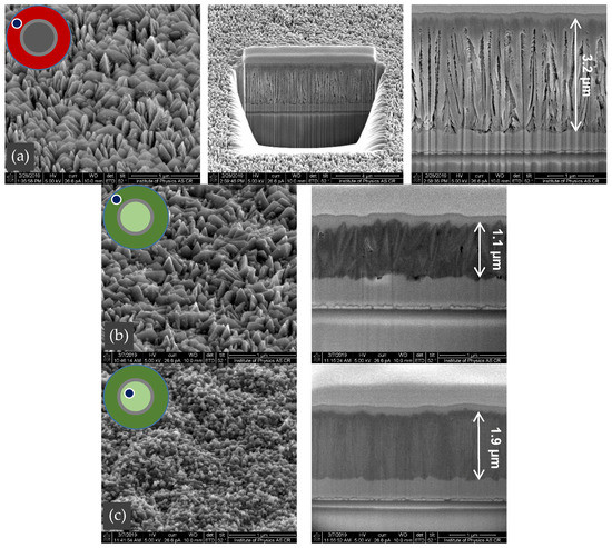 The films were also analyzed by an SEM microscope equipped with a focused ion beam. A small platinum mask was deposited on top of the film. The ion beam then created the sharp cross-section below the mask edge (see Figure 7). The morphology of the film surface with pyramidal crystal shapes, as well as the columnar cross-section structure before (a) and after sulfidation (b), remained almost unchanged. In addition, the pyrite β-FeS2 in the black central part (c) is very similar to Figure 6, number 10, before sulfidation.