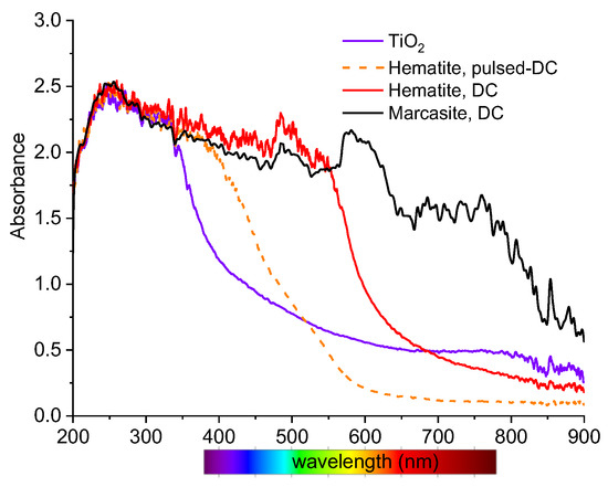 Absorption spectra of the deposited films were measured in the range from 200 to 900 nm, using a deuterium lamp and an HR4000CG-UV-NIR spectrometer (originally Ocean Optics, now Ocean Insight, USA) and are shown in Figure 8. The absorbance of the reference TiO2 film starts to decrease at approximately 350 nm and up to 430 nm more than 90% of the radiation is absorbed. This edge is shifted up by approximately 50 nm for the hematite film deposited in the pulsed DC mode. A further shift up to 600 nm was observed for the red hematite region of the film deposited in the DC mode. This is significant improvement, since the solar radiation spectrum has a maximum at 500 to 600 nm. After sulfidation, the absorption of the marcasite film is extended to 800 nm. The magnetite and pyrite regions of the same films are almost nontransparent, and their absorbance is over the limits of the spectrometer used.