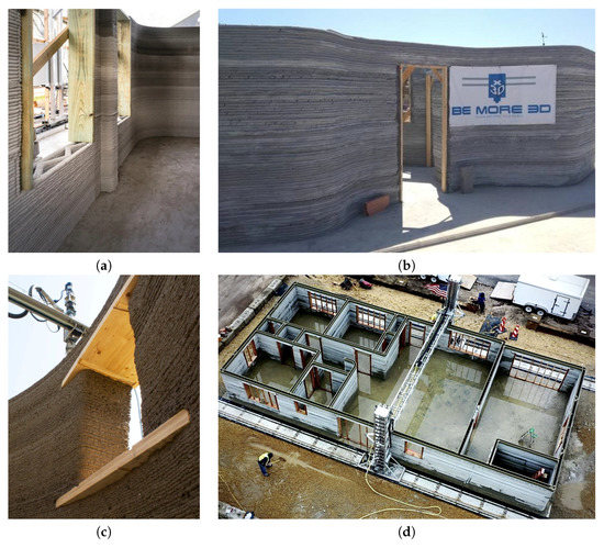 Researchers have paid particular attention to additive manufacturing technology, which has the potential of totally changing methods of construction using concrete and cementitious mortars. In this approach, the mix material is dispensed precisely at pre-determined locations, through a printing head nozzle. The printing head moves in 3D space over a programmed path, building up the designed structure layer by layer [2]. Various types of 3D printers are in use, including Cartesian robots [7,8,9], robotic manipulators [10,11,12] and Delta robots [13,14]. Several objects have already been produced with this technology, both for the purposes of demonstration as well as for practical uses [15,16,17,18,19]. In most cases, over the door and window opening timber shuttering has been used to support the deposited fresh concrete [20,21,22,23] (Figure 1). However, printing machines can also be used for the erection of precast elements, including lintels, floor beams and other structural components [24]. In these applications, the printer must be provided with the appropriate grippers, capable of handling such components.