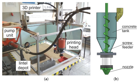 The wall was constructed at a specially designed site, consisting of a 3D robot connected to a pumping module (Figure 2a). The mix was extruded by a screw feeder (Figure 2b), with D = 20 mm nozzle outlet diameter. The printer and printing head motions were controlled by a G-code. The mix was prepared in a laboratory mixer and transferred to the pump unit, from where it was delivered to the printing head hopper through a hose.