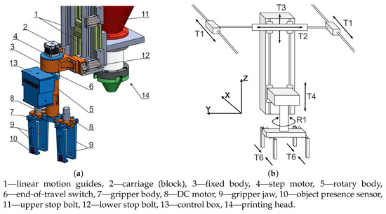 As part of this experiment, a special gripper was built to transfer the lintel from the lintel depot and install it on the wall in determined position. These operations took place when the printing robot was running, with the printing process recommencing as soon as they were completed. The gripper construction was integrated with the 3D printer structure, with the gripper being mounted at the end of the Z column of the printer, which also supported the printing head (Figure 3a). The gripper structure did not interfere with the head movements, during the building of the concrete structure. During the operation of the printer, the gripper adopted the degrees of freedom of the Cartesian robot: T1, T2, T3 linear motions along the X, Y, Z axes, respectively (Figure 3b). The T4 was an auxiliary motion used to move the device outside the printer. The vertical motion of the gripper was affected by the T3 printer motion. Rotational motion R1, about the Z axis, rotated the assembly, comprised of two grippers. The motions of the T6 gripper jaws were synchronized.