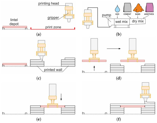 - Step 0: set up all the process elements, i.e., lintel depot, 3D printer, printing head, lintel gripper and process control code (Figure 5a);