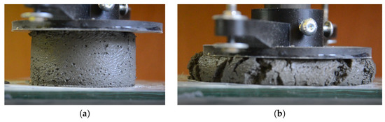 The next step involves determining the allowable stress level in the deposited fresh concrete as a function of time t. The mechanical properties of the concrete mix were determined using a test set-up, simulating the printing process [33]. A sample of fresh concrete, 35 mm high by 60 mm in diameter, was placed between two parallel surfaces and a load of 150 g was applied incrementally on the top surface. The load plate displacement was measured with LVDT inductive sensors. These measurements were used to determine any sample deformations. Figure 7a represents a view of the sample during load application, with Figure 7b representing the sample after failure.