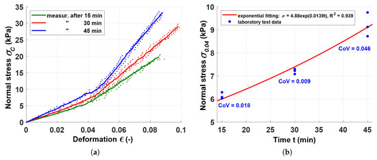 The adopted maximum allowable strain level of 0.04 is acceptable, in the authors’ opinion, and should not have a significant bearing on the strain conditions of the structure under consideration. The relationship between a stress value of 0.04 () and the age of fresh concrete at the start of testing (for t = 15, 30 and 45 min) (Figure 8b), was also determined. A power function was used to describe the (t) relationship, as proposed in [33]. The graphs below show the Coefficient of Variance (CoV) and the coefficient of determination (R) of the function analyzed.