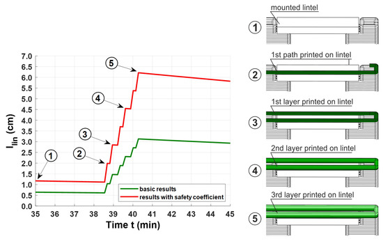Figure 9 presents the relationship between the minimum end bearing length and the time obtained from Equation (8) (red line). It was assumed that the lintel would be installed in the 35th minute, after water was added to the mix. As soon as the gripper had completed its job, the printing head was prepared, so as to commence depositing the first layer of the top wall section over the lintel, in the 38.5th minute. When the first layer is deposited (point 3 in Figure 9), it induces a stress value of at least ca. 2.8 cm in the fresh concrete. According to the printing process simulation, covering all the three layers, the minimum end bearing length should not be smaller than 6.3 cm; thus a value of 6.5 cm was finally adopted for . The minimum end bearing lengths, calculated with Equation (7) but without the application of safety/partial factors according to [42], are presented in Figure 9, for the sake of comparison (green line).