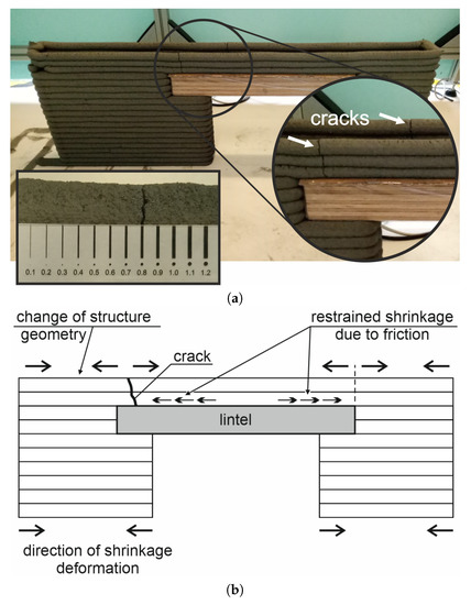 The most serious problem was the cracking observed in the uppermost layers of the printed structure, one day after completion of the printed structure (Figure 12a). Initial small cracks appeared in the top wall section over the lintel which later developed into structural cracks. The cracks occurred close to the upper corners of the opening and were caused by shrinkage restraint. Two different shrinkage mechanisms were involved in this case: plastic shrinkage and autogenous shrinkage [46]. Plastic shrinkage being drying kind of shrinkage of a freshly placed mixture, results from the dynamic tendency towards equilibrium, between the relative humidity of the ambient environment and the moisture content of the material. Autogenous shrinkage, in turn, reduces the volume of the material as a result of chemical reactions in the binder hydration process. Both these shrinkage types occurred very intensively in the initial hours after extrusion. The fresh concrete started to dry right after placement, when it had not, as yet, developed any mechanical resistance properties. The dynamic action of autogenous shrinkage related to the commencement of the setting process, additionally increased drying shrinkage, adding to the drying and autogenous shrinkage deformations. Furthermore, overall shrinkage was restrained, due to the following three factors (Figure 12b): (1) the presence of a rigid lintel beam located over the opening, which acted as a restraint to the shrinking material, (2) the forces of friction between the concrete mix and the lintel beam surface also acted as shrinkage material, (3) the left- and right-hand wall sections were printed in one operation and, as such, their shrinkage involved uniform deformation towards the cross-section core. The dead weights of these wall sections acted as a constraint to the shrinkage of the overlying layers.