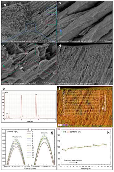 The hydrated enamel fracture exhibits well-packed crystalline rods relatively close and almost parallel with minimal interprismatic matrix area. The enamel rods of a deciduous enamel have an average size of 4.63 ± 0.12 μm slightly less than an adult enamel []. Each rod is wrapped in a sheath of enamel matrix with an interspacing rod of 1.05 ± 0.31 μm on average (Figure 1b, blue arrow), which interacts with the enamel rod crystal to guide and participate in the cooperative self-assembly of the high-order crystalline growth. Inside the rods are evidently aligned and fractured nanometric bundles that may range from 350 to 450 nm in size (Figure 1c, white arrow). These enamel hierarchical structures in nature are a cooperative interaction between matrix assembly and well-organized apatite crystal growth []. The EDS spectrum in Figure 1e of untreated deciduous was probed on the outer cross-sectioned enamel of Figure 1d. The major concentration of Ca and P with minor concentrations of C, O, Mg and trace amounts of Na and Cl (technical back-ground) were evidence of formed hydroxyapatite, providing a Ca/P molar ratio of 1.54 ± 0.39% []. Multi-elemental dual-EDS mapping of O, C, P, Ca elements seems uniformly distributed on the entire cross-section enamel (Figure 1f). To obtain insight into the multi-elemental spatial distribution, different spectra were taken from a selected cross-pattern of the smallest micrometric area, each with a count time of up to 65 Ks. By properly analysing the change of the P and Ca contents along the scanning depth of the enamel layer, the EDS spectra were collected within each rectangular area of 2 × 40 μm2 from the outer to the inner enamel layer sequentially (labelled from 1 to 15), forming a microarray of 30 × 40 μm2 (white dashed lines of Figure 1f). It should be noted that the obtained surface by natural cutting action was not sufficiently smooth to perform a quantitative EDS line scan profile since this microanalysis technique is strictly dependent on the surface roughness. Apparently, the overlapping image maps evidenced a heterogeneous spatial distribution of the C, O, P and Ca elements in the field of view of the cross-section. The different intensity colour in the smallest micrometric regions might be related to the formation of crystalline hydroxyapatite in micro domains. The changing of the P and Ca amounts along the enamel crystal rods partially covered by the interprismatic matrix is clearly shown by the variation in amplitude and in width of the corresponding energy peaks (Figure 1g). For quantifying the P and Ca contents detected in each EDS frame map, each Kα peak was processed by Gaussian fitting to estimate the corresponding peak area []. The estimated areas of each characteristic P and Ca peaks were normalized by the corresponding peak area belonging to the entire probed area of 30 × 40 μm2. This action was useful for light element analysis and for the detected atomic percentage, relatively insensitive to small changes in surface geometry. The ratio of the total integrated counts quantitatively provided the atomic percentage of P and Ca elements between the different spectra acquired along the scanning depth from the outer to the inner surface of the enamel layer (Figure 1h). However, it should be noted that the ratio of the P and Ca peak area exhibited an oscillating difference along the scanning depth profile in which the percentages of phosphate were similar or slightly great than calcium content. To gain a deeper insight into the atomic percentage distributions across the enamel layer, the P and Ca experimental functions were both fitted by linear regression providing intercept values of 95 % and positive slope of 0.30 (Table 1), assumed as reference for the treated deciduous teeth. These results support a low crystallinity organization and an amount of P and Ca closer to the outer enamel surface progressively increasing along the scanning area direction of the growing crystal apatite habitat.