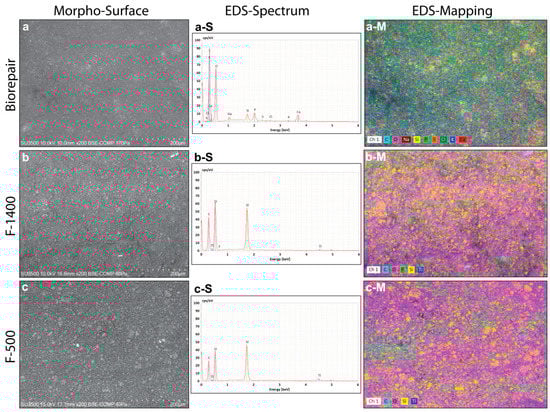 Morpho-chemical analysis of hydrated Biorepair, F1400, and F500 biomaterial toothpastes. (a–c) VP-SEM images illustrating the surface morphology. (a-S, b-S and c-S) EDS spectra probed on the corresponding biomaterials. (a-M, b-M and c-M) multi-elemental mapping image of major constituents.