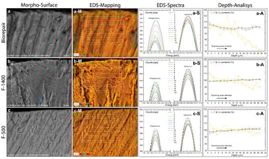 Interestingly, the EDS spectrum revealed also differences in the chemical compositions among toothpastes; indeed, inorganic material constituting an ensemble of C, O, Si, P, and Ca species essential for a proper enamel biomineralization at nanoscale synthesis was only detected for Biorepair (Figure 2a-S). On the other hand, F1400 of 1400 ppm contains only C, O, Si, F and Ti chemical elements similar to F500 expected for the fluorine element of 500 ppm, not technically detectable because of a low concentration (Figure 2b-S,c-S). Evidence of the micrometric roughness arrangement could be also seen by comparing the EDS mapping images, as displayed in Figure 2a-M, b-M, and c-M. In particular, micrometric aggregate of silicates (yellow colour) were present for both F1400 and F500 that cannot be a proper suitable dimension for diffusing inorganic nanomaterials through the enamel layer, but probably act only as a covering layer on the outer enamel.