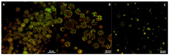 Confocal images of curcumin-loaded microparticles: (A) curcumin (CUR)–oil, (B) CUR–water and (C) CUR–nano-emulsion (NE).
