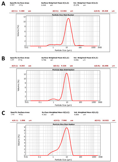 CUR–MPs dimensional analysis by Mastersizer at 3 mg/mL in water solution: (A) CUR–oil, (B) CUR–water and (C) CUR–NE microparticles.