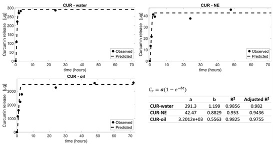 For measuring curcumin release kinetics, the experimental release data of the three MP formulations were fitted using a non-linear first-order equation. Data fittings are shown in Figure 4 together with the extracted model parameters and . The correlation coefficient R2 and adjusted R2 values of CUR–water, CUR–NE and CUR–oil were 0.99, 0.95, 0.98 and 0.98, 0.94 and 0.98, respectively. Therefore, the experimental data were not far from the calculated ones, indicating the suitability of the non-linear first-order kinetic equation model.