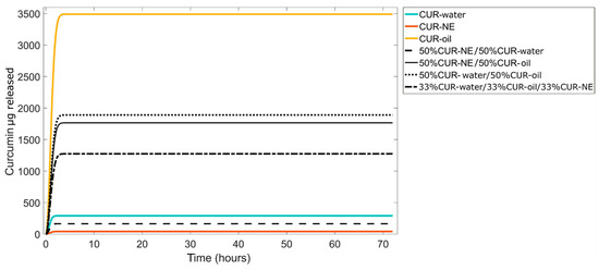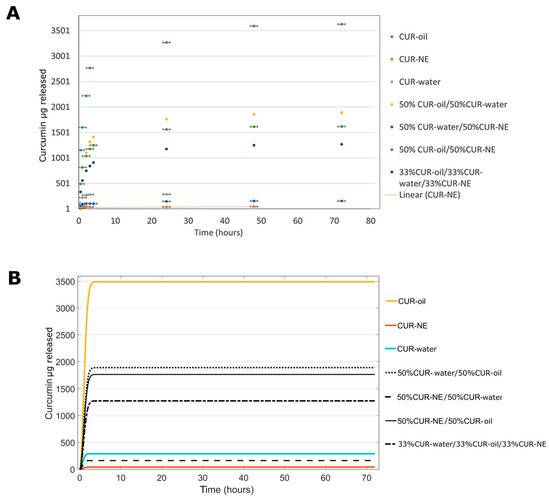 With the aim to understand the reliability and accuracy of the in silico studies, experimental in vitro release profiles of curcumin were performed. Particularly, four different combinations used for theoretical studies were analyzed: (i) 50% of CUR–oil plus 50% CUR–water, (ii) 50% of CUR–oil plus 50% CUR–NE, (iii) 50% of CUR–water–50% CUR–NE and (iv) 33% of all three formulations. Moreover, the release of curcumin from the single formulations was also evaluated as control. Interestingly, as shown in Figure 6A,B, a perfect correlation between hypothetical and experimental results was obtained, confirming that mathematical models can be a great support to reduce the number of experiments and to analyze different conditions and strategies.