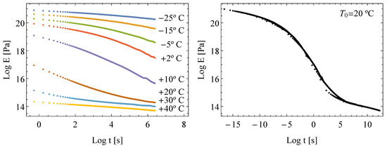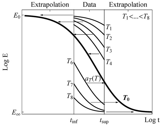 - Derivation of the master curve. The first step consists in deriving the master curve from the experimental data (see Figure 1) by shifting the relaxation curves in the horizontal direction according to the law briefly described in the previous section.