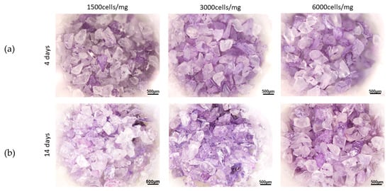 Crystal violet staining of human bone marrow mesenchymal stem cells seeded on 45S5 at 4 days (a) and 14 days (b) after seeding, with 3 different cells densities (1500/mg, 3000/mg and 6000/mg).