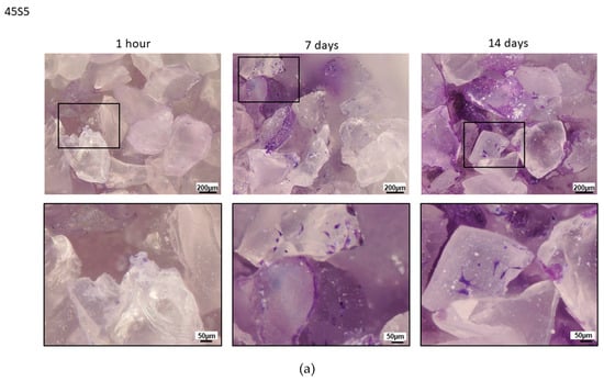 BM–MSCs were seeded in a proper volume of culture medium (200 µl) on dry 45S5 granules, in the ratio of 3000 units for each mg of bioglass. The cells were then observed after 1 h; 4, 7 and 14 days. Surprisingly, both at 1 h post seeding and after 4 days, few adherent BM–MSCs were observed, as reported in Figure 1. After 7 days, just a few zones resulted positive to the crystal violet staining; even after 14 days cells adhesion was not encouraging. Since the results obtained at 3000/mg were not satisfactory, other two cell densities were tested according to the previous work [], namely 1500/mg and 6000/mg. However, none of the densities gave positive results, as shown in Figure 1 as well.