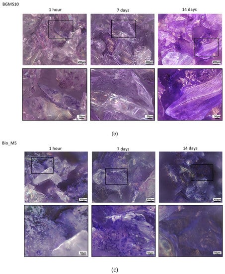 Comparison between 45S5 (a), BGMS10 (b) and Bio_MS (c): crystal violet staining of BM–MSCs seeded on 45S5 (a), BGMS10 (b) and Bio_MS (c) at 1 h, 7 days and 14 days after seeding (cells density: 3000/mg).