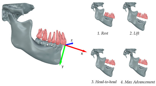 The mandibular kinematics was evaluated in terms of protrusion and opening concerning the LRF, assuming the maxilla as being fixed. The horizontal movement of the mandible along the x-axis caused by the MAD incremental advancement measured the mandibular protrusion. The vertical displacement along the y-axis measured the mouth opening. Four configurations were analyzed.