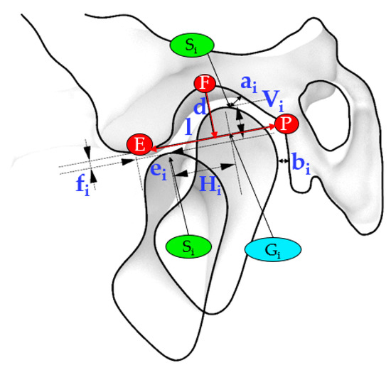 The relative motion of the condyle and the temporal bone was accomplished accordingly to Muto et al. [18]. The anatomical landmarks referred to a sagittal section plane (CP) passing from the midpoint of the line connecting the most medial and most lateral poles of the condyle in frontal view. Subsequently, the authors measured on this sagittal image the length (l) and depth (d) of the glenoid fossa, the minimum distance between the superior most point of the condyle and the temporal bone (ai), the minimum deviation of the condylar head from the temporal bone (bi), the condylar forward (ei), and inferior (fi) displacement from the articular eminence during the advancement of the mandible.