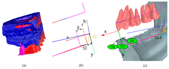 (a) Superimposition of the three scans of the dental casts at Rest (blue), Lift (red), Max advancement (magenta); (b) the construction reference frames (CRFs) overlapped in the upper arch provide the combined translation and rotation during Lift (S1),) and up to Max advancement (S2); (c) mandibular displacement due to the S1 and S2 roto translations and qualitative assessment of the Head-to-head configuration (S2.1).