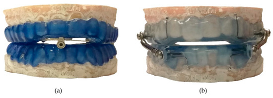 Mandibular advancement devices used in the present study: (a) MAD1 and (b) MAD2.