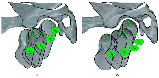 The position of the condyle during the roto-translation was evaluated concerning the resting state. Therefore, it was possible to assess the distance between the Si point at rest and during the mandibular movement according to the successive three configurations (S2, S3, S4), in terms of horizontal (H) and vertical (V) displacements. Figure 3 shows the sections that were used to investigate the relationship between the temporal bone and the mandibular condylar process according to the outlined distances.