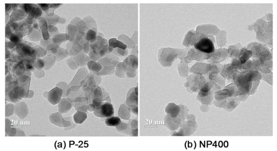 Two types of photocatalytic materials, i.e., the P-25 and NP400, were used with two different weight ratios of 5% and 10% and their transmission electron microscope (TEM) images are shown in Figure 1. The lower case “n” and “p” indicate the NP400 and P-25, respectively, and the subsequent numeral denotes their weight ratios of 5% and 10%. The P-25 was produced by spaying titanium chloride (TiCl4) into a kiln at temperatures ranging from 1000 °C to 1200 °C, while the NP400 was produced from titanium hydroxide (Ti(OH)4) in a vertical rotary kiln at a lower temperature of 600 °C for 4–5 h [7]. Even though the burning temperatures and production processes differed, the shapes and sizes of P-25 and NP400 were quite similar, as shown in Figure 1, coherent with the reports by Rhee et al. [7]. However, their crystal phases were different: the former was a rutile- and anatase-type powder, while the latter was an anatase-type powder because the crystallinity was crucial for the burning temperature. This means that the P-25 was more crystalline than its counterpart, which had a more amorphous structure.