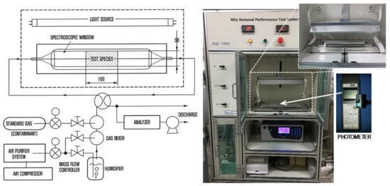 Figure 3 shows the detailed test setup for NOx removal. The NOx removal test was conducted according to standard ISO 22197-1 [20]. Thin HPCC panels with dimensions of 50 mm × 100 mm × 10 mm were used to evaluate the effect of adding the TiO2 powders and white Portland cement on the capacity for NOx removal, compared to that of the OPC. To analyze their net effect, both glass and PE fibers were excluded from the mixture used to make the panel samples. In these tests, an HPCC panel was inserted into the NOx removal machine (Figure 3) and exposed to 1 ± 0.015 ppmv nitric oxide (NO) gas at a flow rate of 3.0 L/min under UV light at 10 W/m2 for 2 h. During the test, the temperature and relative humidity in the chamber were maintained at 25 °C ± 2 °C and 50% ± 5%, respectively. Then, the NO gas flow was carried out in the dark for 30 min, after which the panel was UV-irradiated for 5 h. The NO removal rate was measured using a NOx analyzer (CM2041, Casella, UK) and a photometer (HD9021, Delta Ohm, Italy), and was calculated using the following equation: