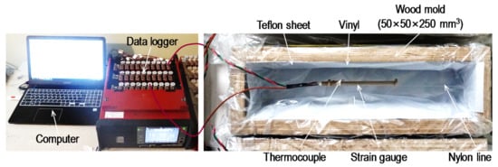 To measure the free shrinkage strain of the HPCCs, a number of prismatic molds with dimensions of 50 mm × 50 mm × 250 mm were prepared, as shown in Figure 4. Similarly to the recommendations of the Japan Concrete Institute (JCI) [21], a very thin Teflon sheet was placed inside the mold to prevent frictional restraint between the fresh HPCCs and inner surface of the mold. Then, a dumbbell-shaped and plastic-embedded strain gauge and a thermocouple were placed at the center of the mold using a nylon line because the self-consolidating nature of the HPCC material made it quite difficult to properly position the instruments after casting. All of the sensors were connected to a data logger system and the measurements were started before adding the concrete to obtain very early age strains. The fresh HPCCs were then placed into the molds and their exposed surface area was covered with a plastic sheet immediately to prevent evaporation. The shrinkage measurements were conducted in a room at constant temperature and humidity (T = 20 °C ± 0.5 °C and RH = 60% ± 5%, where T is the temperature and RH is the relative humidity). At 48 h after casting, the prismatic samples were demolded and exposed to the air in the room.