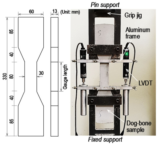 To evaluate the tensile performance of the HPCC, a dog-bone-shaped sample was employed in accordance with the Japan Society of Civil Engineers (JSCE) recommendations [23]; these samples had cross-sectional dimensions of 13 mm × 30 mm and gauge length of 80 mm. Using a UTM with a maximum capacity of 250 kN, a uniaxial tensile force was applied monotonically and the tensile force was recorded by a load cell affixed to the test machine. To measure the elongation of the specimen under the tensile force, two linear variable differential transformers (LVDTs) were installed using an aluminum frame, as shown in Figure 5. The tensile stress was measured by dividing the recorded tensile force by the cross-sectional area; the tensile strain was obtained by dividing the displacement by the gauge length of 80 mm. To minimize the eccentric effect due to a secondary moment generated by asymmetrically formed initial matrix cracks, a fix-pin support condition was adopted, as recommended by Kanakubo [24]. Yoo et al. [25] reported that better fiber alignment to the direction of the tensile force was achieved with a smaller-sized specimen and it led to better flexural (or tensile) performance of the UHPC containing steel fibers. Due to the small sized cross-section of the dog-bone specimen, the tensile test results that were obtained in this study can be mainly used to compare the influences of test variables, i.e., fiber type and content, TiO2 powder, SRA and cement type, on the tensile behavior of HPCC.