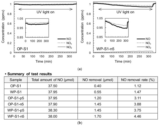 Summary of NO removal rates: (a) typical NOx concentrations and time behaviors (OP-S1 and WP-S1-n5), (b) summary of test results.