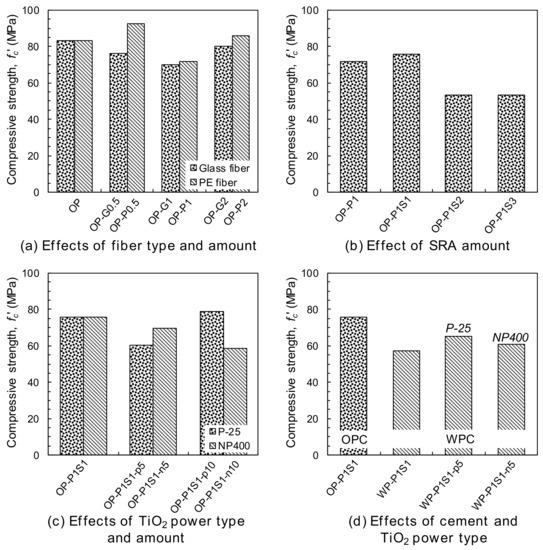 Summary of the compressive strength: (a) the effects of fiber type and amount, (b) the effect of the SRA amount, (c) the effects of the TiO2 powder type and amount, and (d) the effects of the cement and the TiO2 powder type.