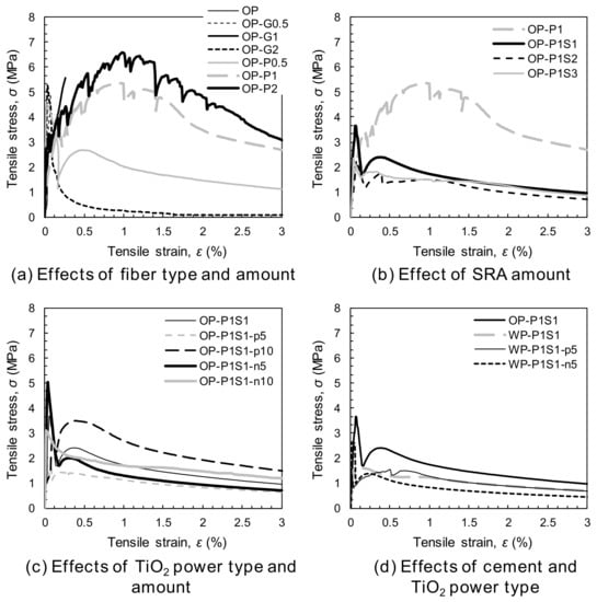 Summary of the tensile stress and strain curves: (a) the effects of the fiber type and amount, (b) the effect of the SRA amount, (c) the effects of the TiO2 powder type and amount, and (d) the effects of the cement and the TiO2 powder type.